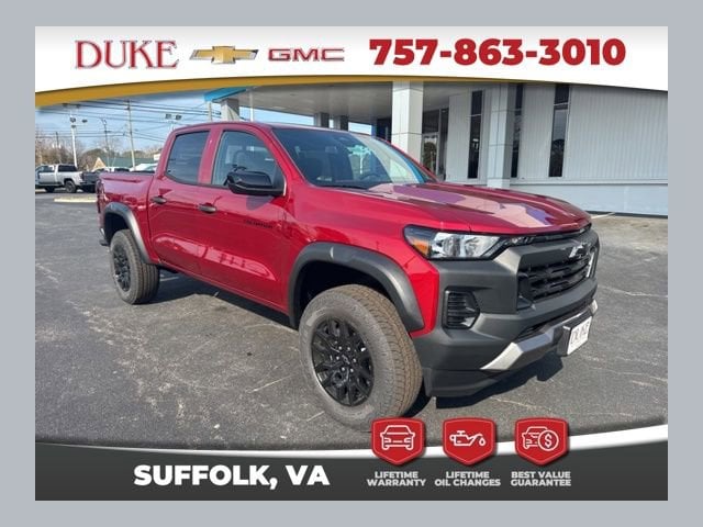 Look at this. 2026 Chevrolet Colorado Trail Boss At Duke Chevrolet GMC in Suffolk VA. 757-539-8777 It's All About U with Lifetime U Rewards. All New Chevy & GMC vehicles come with a Lifetime Powertrain Warranty, Lifetime Oil Changes, our Best Price Guarantee. Plus VA State Inspections, 4-Day 200-Mile Exchange, and Lifetime Service & Parts Guarantee! Read our reviews & see why people choose Duke! Trailboss Package, Trailer Package, Colorado Trail Boss, 4D Crew Cab, 2.7L I4 Turbocharged DOHC 16V LEV3-ULEV50 310hp, 8-Speed Automatic, 4WD, Radiant Red Tintcoat, Jet Black Cloth.