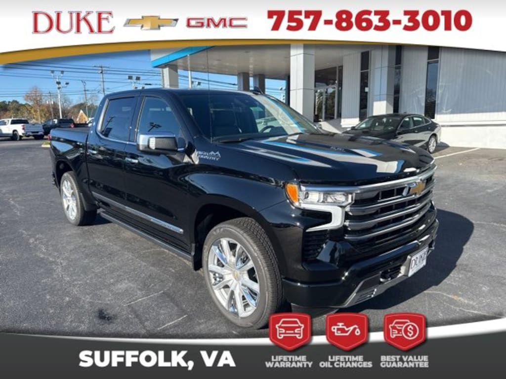 Look at this. 2026 Chevrolet Silverado 1500 High Country At Duke Chevrolet GMC in Suffolk VA. 757-539-8777 It's All About U with Lifetime U Rewards. All New Chevy & GMC vehicles come with a Lifetime Powertrain Warranty, Lifetime Oil Changes, our Best Price Guarantee. Plus VA State Inspections, 4-Day 200-Mile Exchange, and Lifetime Service & Parts Guarantee! Read our reviews & see why people choose Duke! 22 Inch Wheels, High Country Package, 4x4, Forward Collision Alert, Bed Liner, Trailer Package, Adaptive Cruise Control, Super Cruise, Lane Departure Assist, Blind Spot Technology, Heads Up Display, Back Up Warning Sensors, Sunroof / Moonroof, Navigation, Apple CarPlay & Android Auto, 4G LTE WiFi Hotspot Built In, Chevy MyLink, Infotainment Package, Bose Sound System, Premium Audio Package, Back Up Camera, Bluetooth, Sirus XM Radio, OnStar, Heated & Cooled Seats, Leather, Silverado 1500 High Country, 4D Crew Cab, EcoTec3 6.2L V8, 10-Speed Automatic, 4WD, Black, Jet Black Leather, 15 Diagonal Multicolor Head-Up Display, 3 Years OnStar One, All-Weather Floor Liner (LPO), High Country Premium II Super Cruise Package, High Country Premium Package, Navigation System, Power Sunroof, Power-Retractable Assist Steps, Rear Camera Mirror, Sport Wrapped Steering Wheel, Super Cruise, Technology Package, Wheels: 22 x 9 Painted Aluminum.