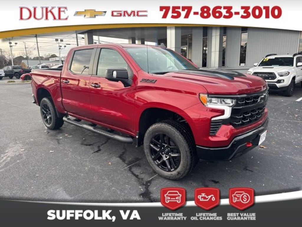 Look at this 2026 Chevrolet Silverado 1500 LT Trail Boss At Duke Chevrolet GMC in Suffolk VA. 757-539-8777 It's All About U with Lifetime U Rewards. All New Chevy & GMC vehicles come with a Lifetime Powertrain Warranty, Lifetime Oil Changes, our Best Price Guarantee. Plus VA State Inspections, 4-Day 200-Mile Exchange, and Lifetime Service & Parts Guarantee! Read our reviews & see why people choose Duke! Z71 Package, Trailboss Package, 2LT Package, 4x4, Forward Collision Alert, Bed Liner, Trailer Package, Lane Departure Assist, Blind Spot Technology, Hill Descent Control, Back Up Warning Sensors, Navigation, Apple CarPlay & Android Auto, 4G LTE WiFi Hotspot Built In, Chevy MyLink, Infotainment Package, Bose Sound System, Premium Audio Package, Back Up Camera, All-Weather Floor Liners, Bluetooth, Sirus XM Radio, OnStar, Leather, Heated Seats, Silverado 1500 LT Trail Boss, 4D Crew Cab, EcoTec3 5.3L V8, 10-Speed Automatic, 4WD, Radiant Red Tintcoat, Jet Black Leather, 10-Way Power Driver Seat w/Lumbar, 120-Volt Bed Mounted Power Outlet, 120-Volt Interior Power Outlet, Black Name Plates (LPO), Chevytec Spray-On Black Bedliner, Convenience Package, Convenience Package II, Dark Essentials Package (LPO), Dual Rear USB Ports (Charge Only), Dual-Zone Automatic Climate Control, Electric Rear-Window Defogger, HD Surround Vision, Heated Driver & Front Outboard Passenger Seats, Heated Steering Wheel, Heavy-Duty Air Filter, Hill Descent Control, Hitch Guidance, Hitch Guidance w/Hitch View, In-Vehicle Trailering System App, Keyless Open & Start, Leather Package, Leather-Appointed Front Seat Trim, LED Cargo Area Lighting, LT Trail Boss Premium Package, Manual Tilt/Telescoping Steering Column, Perimeter Lighting, Power Sliding Rear Window w/Rear Defogger, Power Tailgate, Premium Bose 7-Speaker Sound System, Protection Package, Rear Cross Traffic Braking, Rear Pedestrian Alert, Rear Wheelhouse Liners, Remote Vehicle Starter System, Safety Package, Suspension Package, Theft Deterrent System (Unauthorized Entry), Trailer Camera Provisions, Trailer Side Blind Zone Alert, Trailering Package, Ultrasonic Front & Rear Park Assist, Universal Home Remote, Up-Level Rear Seat w/Storage Package, Wrapped Steering Wheel.