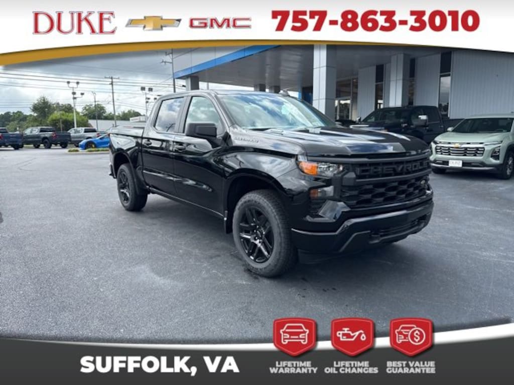 Look at this. 2026 Chevrolet Silverado 1500 Custom At Duke Chevrolet GMC in Suffolk VA. 757-539-8777 "It's All About U" with Lifetime U Rewards. All New Chevy & GMC vehicles come with a Lifetime Powertrain Warranty, Lifetime Oil Changes, our Best Price Guarantee. Plus VA State Inspections, 4-Day 200-Mile Exchange, and Lifetime Service & Parts Guarantee! Read our reviews & see why people choose Duke! 4x4, Silverado 1500 Custom, 4D Crew Cab, 2.7L I4 Turbocharged DOHC 16V LEV3-SULEV30 310hp, 8-Speed Automatic, 4WD, Black, Black Cloth, 10-Way Power Driver Seat w/Lumbar, 120-Volt Bed Mounted Power Outlet, 120-Volt Interior Power Outlet, 3.5" Monochromatic Display Driver Info Center, 4" Black Round Assist Steps (LPO), Black Chrome Exhaust Tip (LPO), Black Name Plates (LPO), Bluetooth® For Phone, Color-Keyed Carpeting Floor Covering, Custom Convenience Package, Custom Value Package, Dark Essentials Package (LPO), Deep-Tinted Glass, Dual Rear USB Ports (Charge Only), Electric Rear-Window Defogger, Electronic Cruise Control, EZ Lift Power Lock & Release Tailgate, Front Frame-Mounted Black Recovery Hooks, Front Rubberized Vinyl Floor Mats, HD Rear Vision Camera, High Capacity Suspension Package, Hitch Guidance, LED Cargo Area Lighting, Manual Tilt Wheel Steering Column, OnStar Services Capable, Power Front Windows w/Driver Express Up/Down, Power Front Windows w/Passenger Express Down, Power Rear Windows w/Express Down, Preferred Equipment Group 1CX, Rear 60/40 Folding Bench Seat (Folds Up), Rear Rubberized-Vinyl Floor Mats, Remote Keyless Entry, Remote Vehicle Starter System, SiriusXM Trial Subscription, Standard Tailgate, Teen Driver, Theft Deterrent System (Unauthorized Entry), Tire Pressure Monitoring System, Trailering Package, TurboMax Blackout Package, Wheels: 20" x 9" High Gloss Black Painted Alum, Wi-Fi Hot Spot Capable.