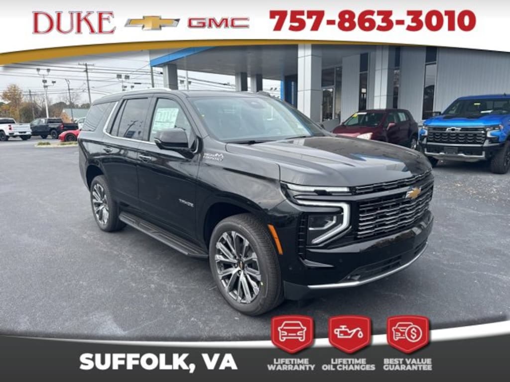 Look at this. 2026 Chevrolet Tahoe High Country At Duke Chevrolet GMC in Suffolk VA. 757-539-8777 It's All About U with Lifetime U Rewards. All New Chevy & GMC vehicles come with a Lifetime Powertrain Warranty, Lifetime Oil Changes, our Best Price Guarantee. Plus VA State Inspections, 4-Day 200-Mile Exchange, and Lifetime Service & Parts Guarantee! Read our reviews & see why people choose Duke! High Country Package, 4x4, Forward Collision Alert, Trailer Package, Adaptive Cruise Control, Lane Departure Assist, Blind Spot Technology, Heads Up Display, 2nd Row Bucket Seats, Power 3rd Row Seats, Sunroof / Moonroof, Navigation, Apple CarPlay & Android Auto, 4G LTE WiFi Hotspot Built In, Chevy MyLink, Infotainment Package, Bose Sound System, Premium Audio Package, Back Up Camera, All-Weather Floor Liners, Bluetooth, Sirus XM Radio, OnStar, Heated & Cooled Seats, Leather, Power Liftgate, 7 Passenger, Tahoe High Country, 4D Sport Utility, EcoTec3 6.2L V8, 10-Speed Automatic with Overdrive, 4WD, Black, Jet Black / Mocha Leather, 2-Speed Active Electronic AutoTrac Transfer Case, Advanced Trailering Package, Dual-Pane Power Panoramic Sunroof, Hill Descent Control, Integrated Trailer Brake Controller, Max Trailering Package, Smart Trailer Integration Indicator.