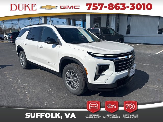 Look at this 2026 Chevrolet Traverse LT At Duke Chevrolet GMC in Suffolk VA. 757-539-8777 It's All About U with Lifetime U Rewards. All New Chevy & GMC vehicles come with a Lifetime Powertrain Warranty, Lifetime Oil Changes, our Best Price Guarantee. Plus VA State Inspections, 4-Day 200-Mile Exchange, and Lifetime Service & Parts Guarantee! Read our reviews & see why people choose Duke! LT Package, Forward Collision Alert, Trailer Package, Adaptive Cruise Control, Lane Departure Assist, Blind Spot Technology, Back Up Warning Sensors, 2nd Row Bucket Seats, 3RD Rrow Seating, Navigation, Apple CarPlay & Android Auto, Back Up Camera, All-Weather Floor Liners, Bluetooth, OnStar, Heated Seats, 7 Passenger, Traverse LT 1LT, 4D Sport Utility, 2.5L DOHC, 8-Speed Automatic, FWD, Summit White, Lt Jet Black Cloth, 1st and 2nd Row All-Weather Floor Liners, 3rd Row All-Weather Floor Liner, Driver Confidence Package, Floor Liner Package, HD Surround Vision, Integrated Cargo Liner, Key Card, Navigation System, Power Outlet, Rear Camera Mirror, Rear Pedestrian Alert, Traffic Sign Recognition.