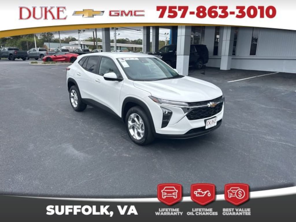 Look at this 2026 Chevrolet Trax LS At Duke Chevrolet GMC in Suffolk VA. 757-539-8777 It's All About U with Lifetime U Rewards. All New Chevy & GMC vehicles come with a Lifetime Powertrain Warranty, Lifetime Oil Changes, our Best Price Guarantee. Plus VA State Inspections, 4-Day 200-Mile Exchange, and Lifetime Service & Parts Guarantee! Read our reviews & see why people choose Duke! LS Package, Forward Collision Alert, Lane Departure Assist, Apple CarPlay & Android Auto, 4G LTE WiFi Hotspot Built In, Chevy MyLink, Infotainment Package, Back Up Camera, All-Weather Floor Liners, Bluetooth, Sirus XM Radio, OnStar, Heated Seats, Trax LS, 4D Sport Utility, ECOTEC 1.2L Turbo, 6-Speed Automatic, FWD, Summit White, Jet Black/Gray With Blue Accents Cloth, Body-Color Painted Mirror Caps, Front & Rear Jet Black All-Weather Floor Liners (LPO), Heated Driver & Front Passenger Seats, Heated Power-Adjustable Outside Mirrors, Illuminated entry, LS Convenience Package, Power steering, Power windows, Remote keyless entry, Remote Start, Security system, SiriusXM Trial Subscription, Spoiler, Steering wheel mounted audio controls, Wheels: 17 Silver Painted Aluminum.