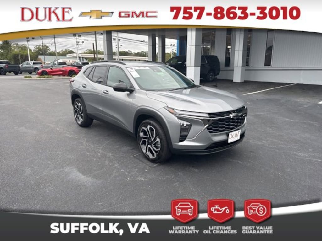 Look at this. 2026 Chevrolet Trax 2RS At Duke Chevrolet GMC in Suffolk VA. 757-539-8777 It's All About U with Lifetime U Rewards. All New Chevy & GMC vehicles come with a Lifetime Powertrain Warranty, Lifetime Oil Changes, our Best Price Guarantee. Plus VA State Inspections, 4-Day 200-Mile Exchange, and Lifetime Service & Parts Guarantee! Read our reviews & see why people choose Duke! Forward Collision Alert, Adaptive Cruise Control, Lane Departure Assist, Blind Spot Technology, Back Up Warning Sensors, Apple CarPlay & Android Auto, 4G LTE WiFi Hotspot Built In, Chevy MyLink, Infotainment Package, Back Up Camera, All-Weather Floor Liners, Bluetooth, Sirus XM Radio, OnStar, Heated Seats, Trax 2RS, 4D Sport Utility, ECOTEC 1.2L Turbo, 6-Speed Automatic, FWD, Sterling Gray Metallic, Jet Black With Red Accents Evotex, Adaptive Cruise Control, Driver Confidence Package, Lane Change Alert w/Side Blind Zone Alert, License Plate Front Mounting Package, Rear Cross Traffic Alert, Rear Park Assist.