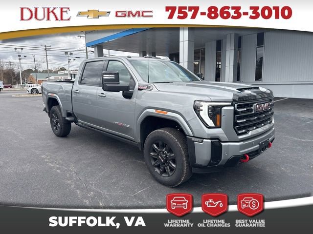 Look at this 2026 GMC Sierra 2500HD AT4 At Duke Chevrolet GMC in Suffolk VA. 757-539-8777 It's All About U with Lifetime U Rewards. All New Chevy & GMC vehicles come with a Lifetime Powertrain Warranty, Lifetime Oil Changes, our Best Price Guarantee. Plus VA State Inspections, 4-Day 200-Mile Exchange, and Lifetime Service & Parts Guarantee! Read our reviews & see why people choose Duke! AT4 Package, 4x4, Forward Collision Alert, Bed Liner, Trailer Package, Adaptive Cruise Control, Lane Departure Assist, Blind Spot Technology, Heads Up Display, Back Up Warning Sensors, Navigation, Apple CarPlay & Android Auto, Bose Sound System, Premium Audio Package, Back Up Camera, All-Weather Floor Liners, OnStar, Heated & Cooled Seats, Leather, Sierra 2500HD AAT4, 4D Crew Cab, Duramax 6.6L V8 Turbodiesel, 10-Speed Automatic, 4WD, Sterling Metallic, Jet Black With Kalahari Accents Leather, 120-Volt Bed Mounted Power Outlet, 120-Volt Instrument Panel Power Outlet, 2 Charge-Only Rear USB Ports, 2 Charge/Data USB Ports Inside Center Console, 2 USB Ports, 2-Speed Active Transfer Case, AT4 Preferred Package, Bed View Camera with Two Trailer Camera Provisions, Bose Premium 7-Speaker Sound System, Deep-Tinted Glass, Electric Rear-Window Defogger, Floor-Mounted Center Console, Front Premium Floor Liners with Removable Carpet Insert, Front Rain-Sensing Wipers, Gloss Black Header Grille and Grille Insert Bars, Gooseneck/5th Wheel Prep Package, HD Surround Vision, Heated 2nd Row Outboard Seats, Heated Driver and Front Outboard Passenger Seats, Hill Descent Control, Hitch Package, Inside Rearview Auo-Dimming Rear Camera Mirror, Keyless Open and Start, LED Cargo Area Lighting, LED Smoked Amber Roof Marker Lamps, Manual Tilt-Wheel/Telescoping Steering Column, Multicolor 15 Diagonal Head-Up Display, Navigation System, Off-Road Suspension, OnStar Services Capable, Power Front Passenger Windows with Express Up/Down, Power Sliding Rear Window with Defogger, Preferred Equipment Group 4SB, Push Button Start, Rear Cross Traffic Alert, Rear Premium Floor Liners with Removable Carpet Insert, Rear Wheelhouse Liners, Remote Vehicle Starter System, Safety Alert Seat, SiriusXM with 360L Trial Subscription, Spray-on Pickup Bedliner with GMC Logo, Steering Wheel Audio Controls, Technology Package, Trailer Cam Provisions and Trailer Viewing Software, Trailer Side Blind Zone Alert, Ultrasonic Front and Rear Park Assist, Unauthorized Entry Theft-Deterrent System, Universal Home Remote, Ventilated Driver and Front Passenger Seats, Wireless Charging, Wireless Phone Projection, X31 Off-Road Package.