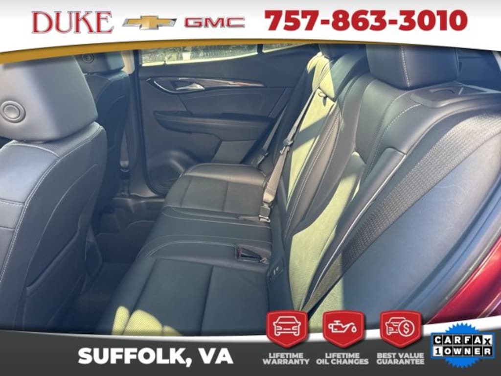 The 2023 Buick Envision Essence represents a refined balance of modern luxury, advanced engineering, and everyday practicality, offering drivers a premium experience that seamlessly blends comfort and performance. Now available at Duke Chevrolet GMC in Suffolk, Virginia, this CARFAX One-Owner SUV stands out as a meticulously maintained vehicle supported by a clean history and a documented record of responsible previous ownership. Finished in the rich and distinctive Cinnabar Metallic exterior with Ebony Leather seating, the Envision Essence exudes sophistication from every angle, pairing sleek body lines with elegant design cues that showcase Buicks signature approach to craftsmanship and contemporary styling. This 4D Sport Utility model is equipped with a responsive 2.0-liter turbocharged engine paired with a smooth 9-speed automatic transmission that delivers energetic acceleration, composed handling, and remarkable fuel efficiency. The front-wheel-drive configuration provides stable on-road performance ideal for daily commuting and long-distance travel. Customers who purchase from Duke Chevrolet GMC also benefit from the dealerships exclusive Lifetime U Benefits, which include Lifetime Oil Changes, a 12-Month/12,000-Mile Powertrain Warranty, Lifetime Virginia State Inspections, a 4-Day/200-Mile Exchange Program, and a Lifetime Service and Parts Guarantee, offering unmatched value, peace of mind, and a commitment to long-term customer care that has made Duke a trusted name throughout the region.