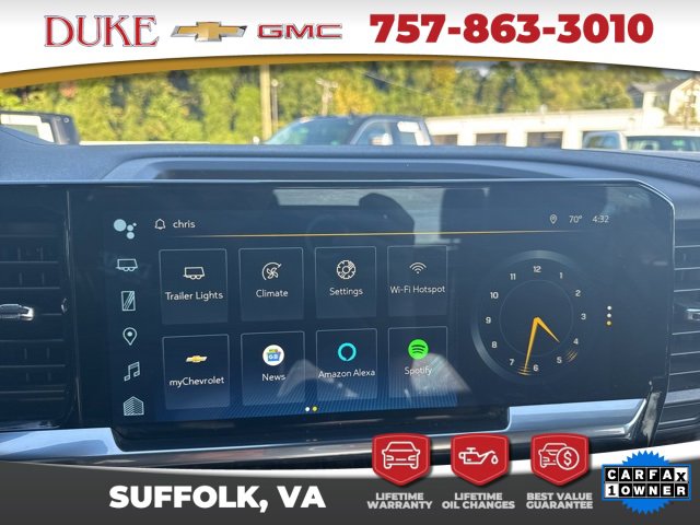 Inside, the 2022 Silverado 1500 LT delivers a cabin designed with both functionality and luxury in mind, transforming ruggedness into refinement. The spacious 4D Crew Cab provides ample legroom for both driver and passengers, with Black cloth seating that combines durability with comfort. The 10-way power driver seat with lumbar support ensures long-haul comfort, while heated driver and front outboard passenger seats add warmth and ease for colder months. Dual-zone automatic climate control allows individualized comfort settings for the driver and front passenger, emphasizing convenience on every drive. The cabin is a showcase of modern connectivity, featuring a state-of-the-art infotainment system that integrates seamlessly with Apple CarPlay and Android Auto, offering voice-activated access to navigation, communication, and entertainment. The premium audio system fills the interior with crisp, immersive sound, while Bluetooth technology ensures effortless connectivity for music streaming and hands-free calls. The heated leather-wrapped steering wheel adds a touch of elegance while providing a firm, responsive grip. For practicality, the cabin includes multiple USB charging ports, power outlets, and intuitive storage spaces, making it as functional as it is refined. Every inch of this Silverado's interior reflects a design philosophy focused on comfort, usability, and style a truck built not just for work but for everyday life. Duke Chevrolet GMC enhances that comfort by extending its Lifetime U Benefits, guaranteeing that oil changes, inspections, and essential maintenance are taken care of for as long as the Silverado remains yours. This dedication to service transforms ownership from a simple transaction into a partnership built around reliability and peace of mind.