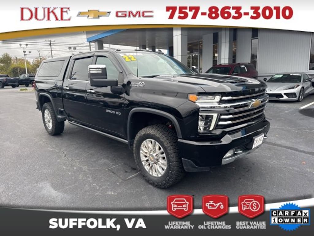 2022 Chevrolet Silverado 3500HD High Country At Duke Chevrolet GMC in Suffolk VA. 757-539-8777. Lifetime Oil Changes, 12-Month 12,000 Mile Powertrain Warranty, VA State Inspections, 4-Day 200-Mile Exchange, and Lifetime Service & Parts Guarantee! All included with our Lifetime U Benefits! Read our reviews & see why people choose Duke! Lifetime U Rewards with Lifetime Oil Changes, 12-Month 12,000-Mile Powertrain Warranty and more!, CarFax 1-Owner Clean History Report, Carfax Clean History Report, High Country Package, Duramax Turbo Diesel, 4x4, Bed Liner, Trailer Package, Blind Spot Technology, Back Up Warning Sensors, Apple CarPlay & Android Auto, Infotainment Package, Premium Audio Package, Back Up Camera, Bluetooth, Sirus XM Radio, OnStar, Silverado 3500HD High Country, 4D Crew Cab, Duramax 6.6L V8 Turbodiesel, 10-Speed Automatic, 4WD, Black, Jet Black Leather, 12-Volt Rear Auxiliary Power Outlet, 120-Volt Bed Mounted Power Outlet, 120-Volt Instrument Panel Power Outlet, 170 Amp Alternator, 220 Amp Alternator, 2nd Row Dual USB Charge-Only Ports, 6 Rectangular Chromed Tubular Assist Steps, 7 Speakers, 8 Driver Information Center, Advanced Trailering System, Air Conditioning, Alloy wheels, Auto-Dimming Inside Rear-View Mirror, Auto-Dimming Inside Rearview Mirror w/Camera, Automatic Emergency Braking, Automatic temperature control, Bed View Camera w/2 Trailer Camera Provisions, Bluetooth® For Phone, Chevrolet Connected Access Capable, Chevytec Spray-On Black Bedliner w/Chevrolet Logo, Chrome Front Grille Bar w/Chrome Grille Inserts, Chrome Mirror Caps, Color-Keyed Carpeting Floor Covering, Compass Located In Instrument Cluster, Deep-Tinted Glass, Electric Rear-Window Defogger, Electrical Lock Control Steering Column, Following Distance Indicator, Forward Collision Alert, Front Carpeted Floor Mats, Front Chrome Recovery Hooks, Front LED Fog Lamps, Gooseneck/5th Wheel Prep Package, HD Surround Vision w/2 Trailer View Camera Provisions, Heated Steering Wheel, High Country Deluxe, Hill Descent Control, Hitch Guidance w/Hitch View, Integrated Trailer Brake Controller, IntelliBeam Automatic High Beam On/Off, Keyless Open & Start, Lane Change Alert w/Side Blind Zone Alert, Lane Departure Warning System, Leather-Wrapped Steering Wheel, LED Cargo Area Lighting, Manual Tilt/Telescoping Steering Column, Multicolor 15 Diagonal Head-Up Display, Navigation System, OnStar & Chevrolet Connected Services Capable, Panic alarm, Polished Exhaust Tip, Power Door Locks, Power Front Passenger Windows w/Express Up/Down, Power Front Windows w/Driver Express Up/Down, Power Rear Windows w/Express Down, Power Sliding Rear Window w/Defogger, Power-Adjustable Outside Mirrors, Preferred Equipment Group 3LZ, Rear Carpeted Floor Mats, Rear Cross Traffic Alert, Rear Wheelhouse Liners, Remote Vehicle Starter System, Safety Alert Seat, Safety Package II, Security system, SiriusXM w/360L, Snow Plow Prep/Camper Package, Speed control, Standard Tailgate, Steering Wheel Audio Controls, Steering Wheel Mounted Electronic Cruise Control, Suspension Package, Technology Package, Unauthorized Entry Theft-Deterrent System, Universal Home Remote, Up-Level Rear Seat w/Storage Package, Variably intermittent wipers, Wi-Fi Hotspot Capable, Wireless Charging, Wireless Phone Projection, Z71 Off-Road Package.