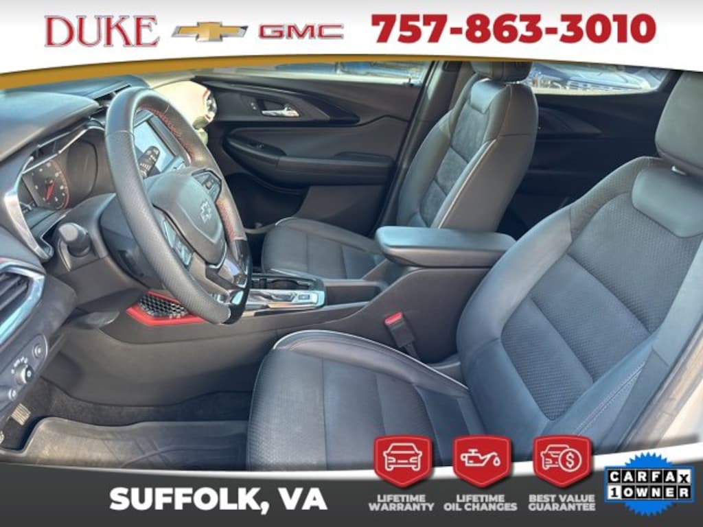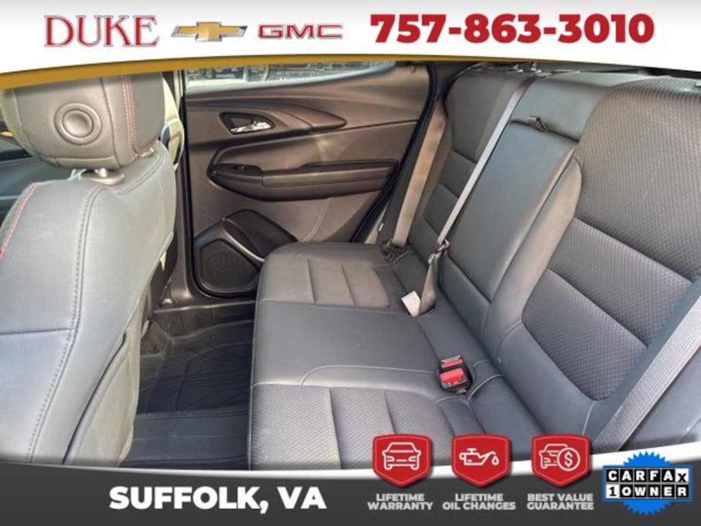 The 2022 Chevrolet TrailBlazer RS embodies a perfect balance of style, performance, technology, and modern convenience, making it one of the most desirable compact SUVs for drivers who want capability without sacrificing comfort. Now available at Duke Chevrolet GMC in Suffolk, Virginia, this CARFAX One-Owner TrailBlazer stands out immediately thanks to its clean history, its careful maintenance by a non-smoker, and its status as a local trade that has never been used as a rental. Finished in Summit White with a striking Jet Black cloth interior accented by vivid red stitching, this TrailBlazer RS projects a bold yet refined personality that fits perfectly into both urban and rural lifestyles. Under the hood, a 1.3-liter Ecotec turbocharged DOHC SIDI engine with VVT is paired with a smooth 9-speed automatic transmission, making the vehicle responsive, energetic, fuel-efficient, and capable on a wide variety of road conditions. Its AWD system ensures the TrailBlazer RS remains planted with confidence whether navigating rainy highways, gravel roads, or winter weather. As with every qualifying vehicle purchased at Duke Chevrolet GMC, buyers receive the dealerships exclusive Lifetime U Benefits, which include Lifetime Oil Changes, a 12-Month/12,000-Mile Powertrain Warranty, Lifetime Virginia State Inspections, a 4-Day/200-Mile Exchange Policy, and a Lifetime Service and Parts Guarantee. This comprehensive package reflects Dukes commitment to long-term customer care and adds significant value to the ownership experience, making the TrailBlazer RS both a practical and rewarding choice for drivers throughout Virginia.