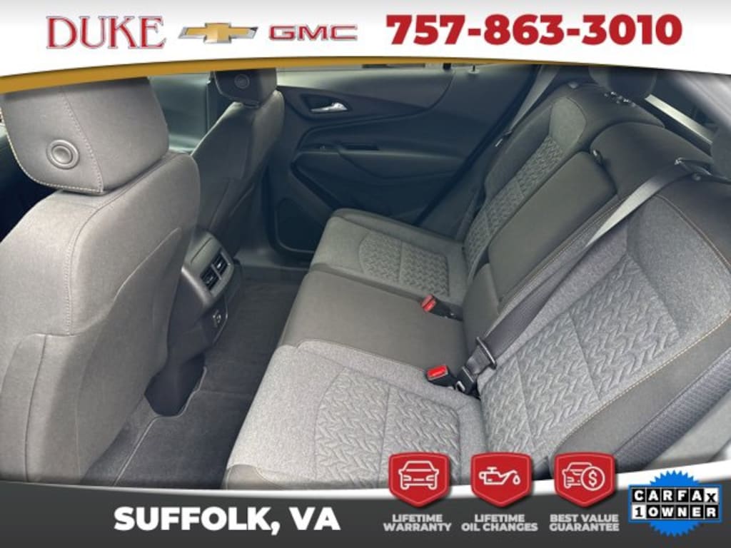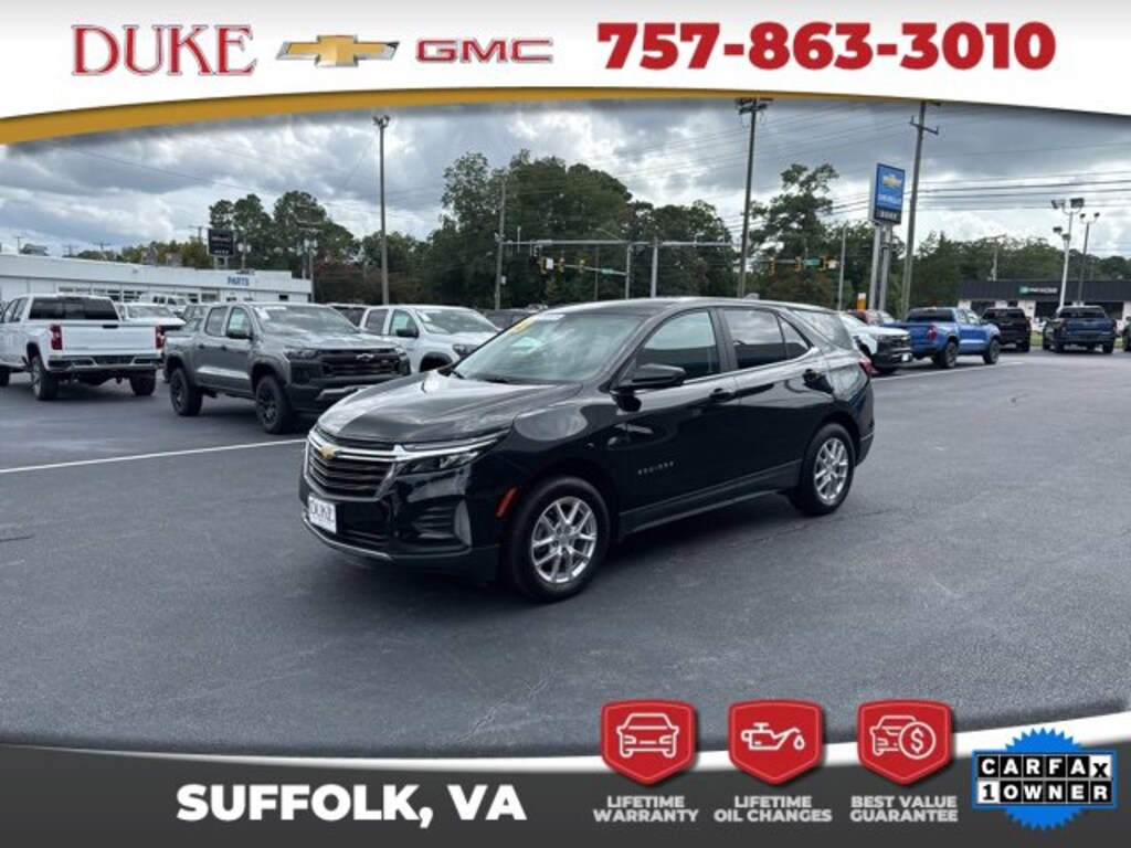 The 2023 Chevrolet Equinox LT stands as a perfect reflection of modern SUV design sleek, efficient, and filled with innovation that enhances every mile. Available at Duke Chevrolet GMC in Suffolk, Virginia, and easily reached by calling 757-539-8777, this CARFAX One-Owner vehicle presents an outstanding opportunity for drivers seeking a dependable, stylish, and feature-rich crossover. With an odometer reading 3,214 miles below market average, this Equinox represents exceptional value and quality that distinguishes it from others on the market. Finished in a striking Mosaic Black Metallic exterior paired with a refined Black Cloth interior, the Equinox LT blends sophistication with versatility, making it equally suited for family trips, daily commutes, or weekend adventures. Beneath the hood lies a 1.5-liter DOHC turbocharged engine paired with a 6-speed automatic electronic transmission with overdrive, delivering smooth power and impressive fuel efficiency while maintaining excellent control through its advanced All-Wheel Drive system. The vehicles aerodynamic design enhances performance and efficiency while giving it a bold and commanding presence on the road. Every detail of the Equinox LTs construction is engineered to deliver comfort, safety, and confidence, whether driving through city streets or cruising the open highway. When purchased from Duke Chevrolet GMC, this vehicle is accompanied by the dealerships exclusive Lifetime U Benefitsan industry-leading package that includes Lifetime Oil Changes, a 12-Month/12,000-Mile Powertrain Warranty, Lifetime Virginia State Inspections, a 4-Day/200-Mile Exchange Policy, and a Lifetime Service and Parts Guarantee. These benefits ensure not just peace of mind but ongoing value and care, reinforcing Dukes well-earned reputation for integrity, excellence, and long-term customer commitment.