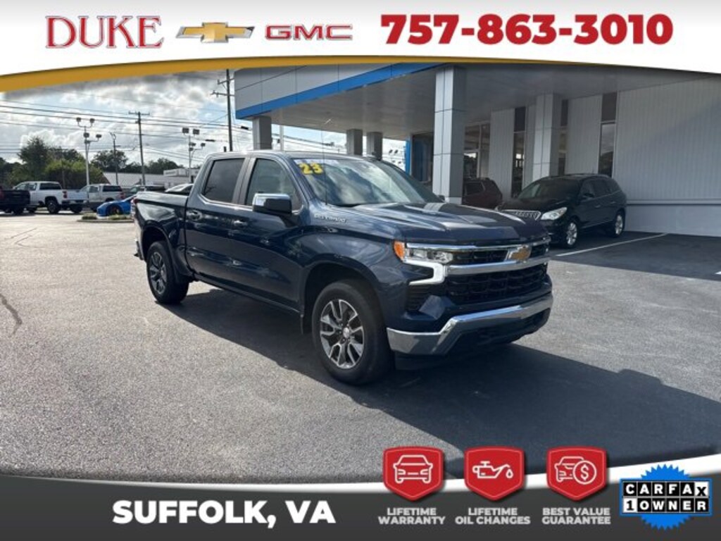 The 2023 Chevrolet Silverado 1500 LT represents the pinnacle of modern truck craftsmanship, combining raw power, refined comfort, and advanced technology into one extraordinary package. Available now at Duke Chevrolet GMC in Suffolk, Virginia, and easily reachable by calling 757-539-8777, this CARFAX One-Owner Silverado offers a rare opportunity for drivers who demand performance, reliability, and sophistication in equal measure. With an odometer reading 727 miles below the market average, this truck stands as an exceptional value for anyone seeking both strength and refinement in a full-sized pickup. Finished in a stunning Northsky Blue Metallic exterior paired with a premium Black Cloth interior, the Silverado 1500 LT commands attention with its bold styling and rugged stance. Under the hood, the powerful and efficient 2.7-liter turbocharged engine delivers responsive acceleration and impressive torque, paired with an 8-speed automatic transmission that ensures smooth and precise shifting for every drive. Equipped with a 4x4 drivetrain, this truck provides confident handling and traction across all types of terrain, making it equally capable on highways, construction sites, or off-road adventures. Its 4D Crew Cab configuration offers spacious seating and versatile storage for both work and family use, while the LT Package adds refined details that elevate its appearance and comfort. The Silverados modern engineering and high-strength build reflect Chevrolets long-standing legacy of durability and capability. When you purchase this vehicle from Duke Chevrolet GMC, you receive the dealerships exclusive Lifetime U Benefits an unmatched ownership package that includes Lifetime Oil Changes, a 12-Month/12,000-Mile Powertrain Warranty, Lifetime Virginia State Inspections, a 4-Day/200-Mile Exchange Policy, and a Lifetime Service and Parts Guarantee. These benefits are designed to ensure long-term peace of mind, outstanding value, and continued satisfaction that last well beyond the first drive.