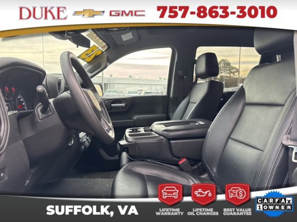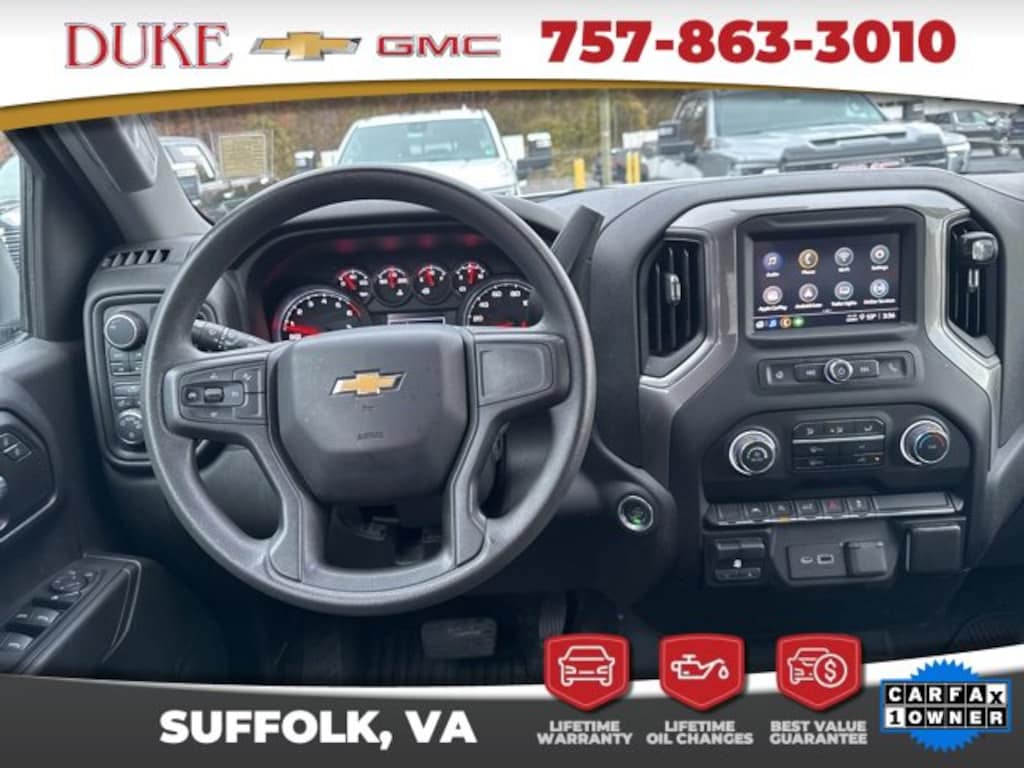 The 2023 Chevrolet Silverado 1500 Custom delivers a confident combination of modern truck capability, advanced safety technology, and everyday comfort, making it an exceptional choice for drivers who need a dependable full-size pickup that can handle both work and lifestyle demands. Available now at Duke Chevrolet GMC in Suffolk, Virginia, this CARFAX One-Owner Silverado comes with a clean ownership history and reflects careful use as a local trade that was never a rental and owned by a non-smoker, adding an extra level of confidence for its next owner. Finished in a clean and professional Summit White exterior paired with a durable Black Cloth interior, this Silverado 1500 Custom presents a strong, purposeful appearance that fits seamlessly on job sites, highways, and neighborhood streets alike. The 4D Crew Cab configuration provides generous interior space, ensuring comfort for passengers while still delivering the rugged utility expected from a Silverado. Under the hood, the efficient yet powerful 2.7-liter turbocharged engine is paired with an 8-speed automatic transmission, delivering responsive acceleration, smooth shifting, and impressive torque for towing and hauling. The 4WD system enhances traction and control, giving drivers confidence across changing road conditions and terrain. Every vehicle purchased at Duke Chevrolet GMC includes the exclusive Lifetime U Benefits, featuring Lifetime Oil Changes, a 12-Month or 12,000-Mile Powertrain Warranty, Lifetime Virginia State Inspections, a 4-Day or 200-Mile Exchange Policy, and a Lifetime Service and Parts Guarantee, providing long-term value and peace of mind that extends well beyond the day of purchase.
