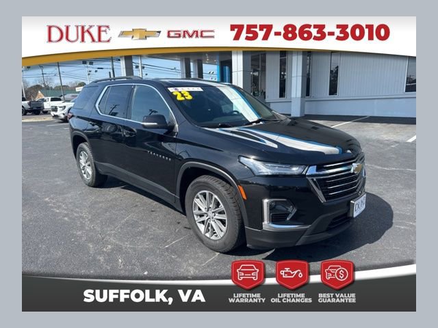 2023 Chevrolet Traverse LT CARFAX One-Owner. At Duke Chevrolet GMC in Suffolk VA. 757-539-8777. Lifetime Oil Changes, 12-Month 12,000 Mile Powertrain Warranty, VA State Inspections, 4-Day 200-Mile Exchange, and Lifetime Service & Parts Guarantee! All included with our Lifetime U Benefits! Read our reviews & see why people choose Duke! Traverse LT 1LT, 4D Sport Utility, 3.6L V6 SIDI VVT, 9-Speed Automatic, AWD, Mosaic Black Metallic, Jet Black Cloth.