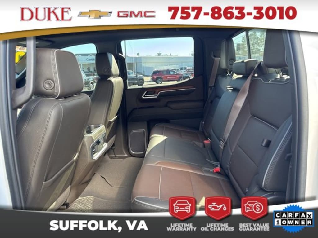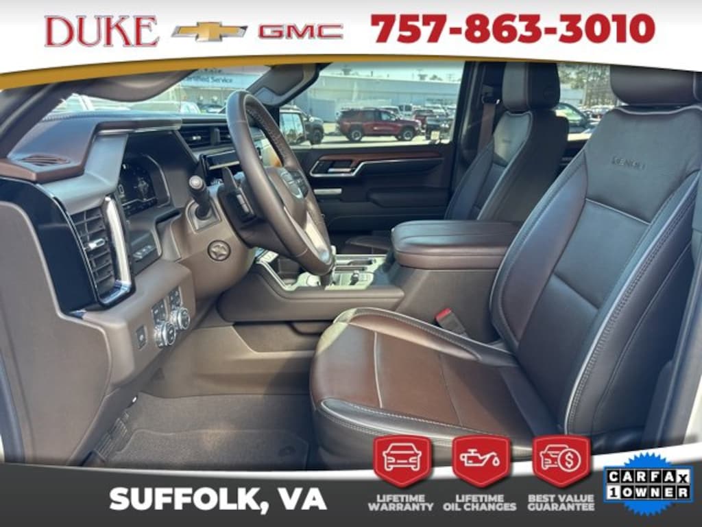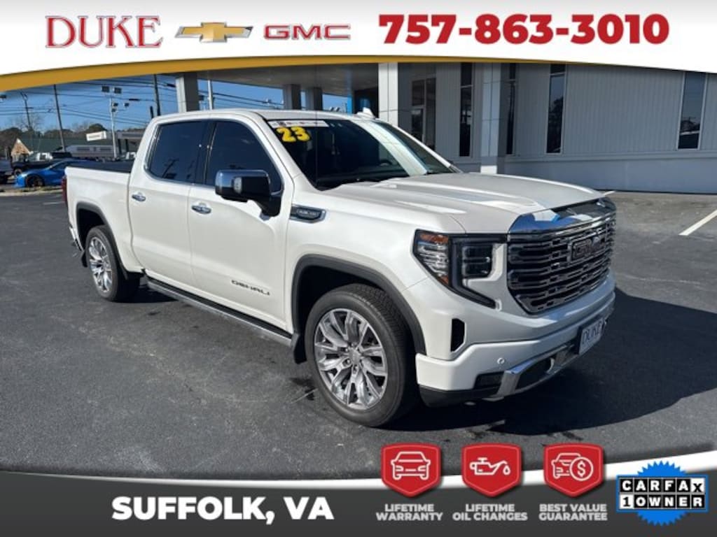 The 2023 GMC Sierra 1500 Denali represents the absolute pinnacle of modern full-size pickup trucks, blending commanding strength, refined luxury, advanced technology, and unmistakable presence into one exceptionally well-rounded vehicle. Offered at Duke Chevrolet GMC in Suffolk, Virginia, this Sierra 1500 Denali carries a clean CARFAX one-owner history and reflects the level of care and attention expected from a premium local trade that has never been a rental and has been maintained with pride. Finished in striking White Frost Tricoat and paired with a rich Atmosphere and Brownstone leather interior, this Denali delivers an immediate impression of sophistication and confidence. From the moment it is seen, the Sierra Denali communicates authority through its bold stance, signature Denali chrome grille, sculpted body lines, and premium detailing that elevate it well beyond the standard pickup category. Beneath the hood, the proven EcoTec3 5.3 liter V8 engine works in harmony with a refined 10 speed automatic transmission, providing seamless power delivery, strong torque, and confident acceleration whether cruising on the highway, towing heavy loads, or navigating demanding terrain. The advanced four wheel drive system ensures stability and traction in all conditions, giving drivers peace of mind year round. As with every qualifying vehicle from Duke Chevrolet GMC, this Sierra Denali is supported by Lifetime U Benefits that include Lifetime Oil Changes, a 12 month or 12,000 mile Powertrain Warranty, Lifetime Virginia State Inspections, a 4 day or 200 mile Exchange Policy, and a Lifetime Service and Parts Guarantee, creating an ownership experience that extends far beyond the initial purchase and reinforces why so many customers continue to choose Duke.