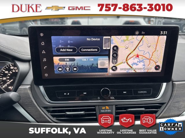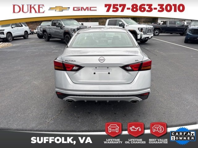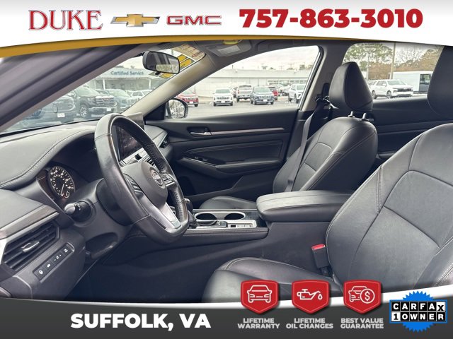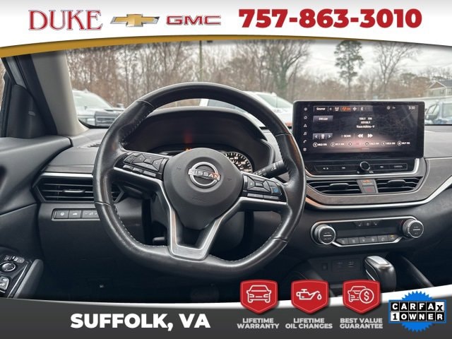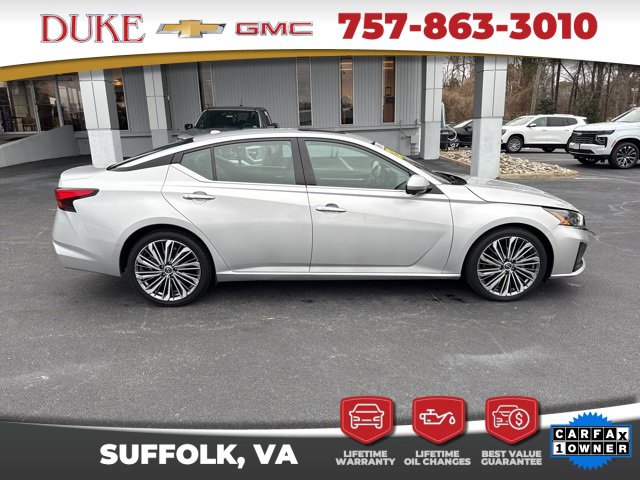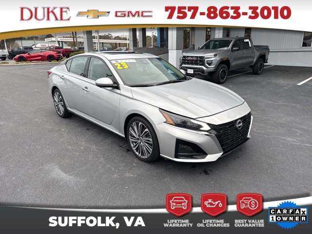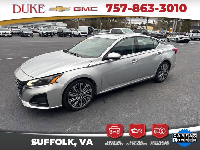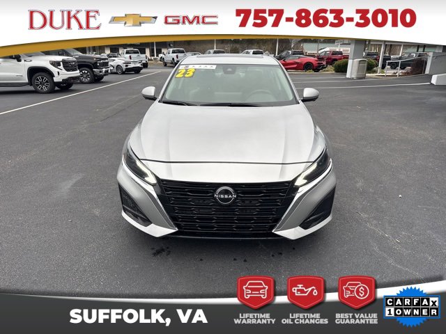 The 2023 Nissan Altima 2.5 SL offered at Duke Chevrolet GMC in Suffolk Virginia stands as an exceptional example of modern sedan engineering, blending elegant design, advanced technology, and impressive efficiency into one refined package. This CARFAX One Owner vehicle features a clean history report and an odometer reading 6043 miles below the market average, making it a rare opportunity for buyers seeking outstanding value with verified quality. Finished in Brilliant Silver Metallic, the exterior delivers a sleek and timeless appearance that reflects sophistication without being overstated. The sculpted body lines, aerodynamic profile, and confident stance give the Altima a premium presence on the road while remaining practical for everyday use. Inside, the Charcoal Leather interior creates a refined atmosphere that feels upscale and welcoming, offering comfort and durability for both daily commuting and long-distance travel. As a non-smoker vehicle, the cabin remains fresh and well preserved, reinforcing the care taken by its previous owner. Backed by Duke Chevrolet GMCs Lifetime U Benefits program, this Altima includes Lifetime Oil Changes, a 12 Month 12,000 Mile Powertrain Warranty, Lifetime Virginia State Inspections, a 4 Day 200 Mile Exchange Policy, and a Lifetime Service and Parts Guarantee, providing unmatched peace of mind and long-term ownership confidence.